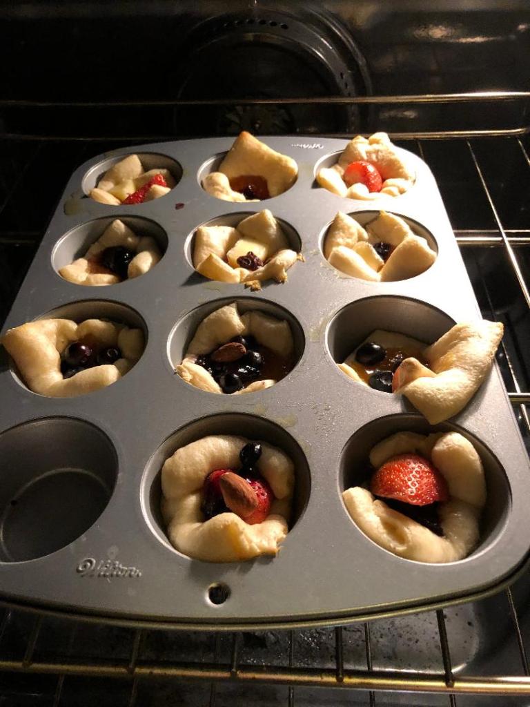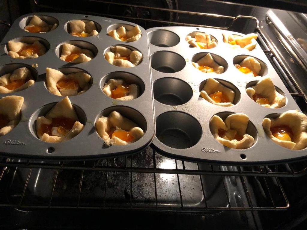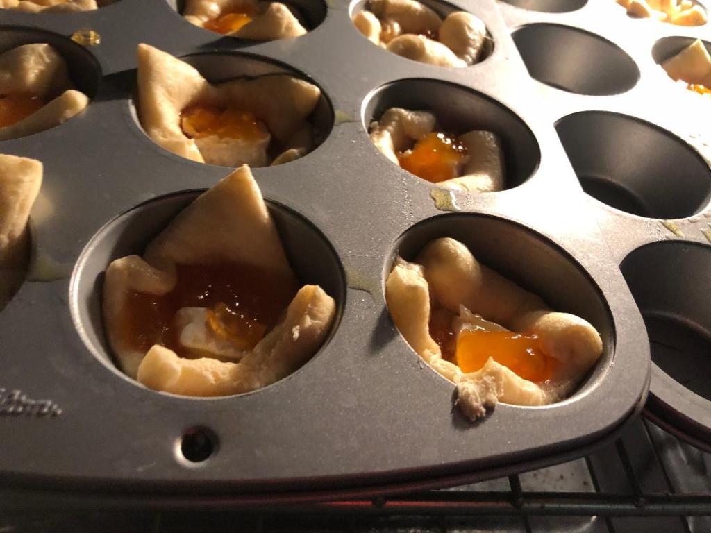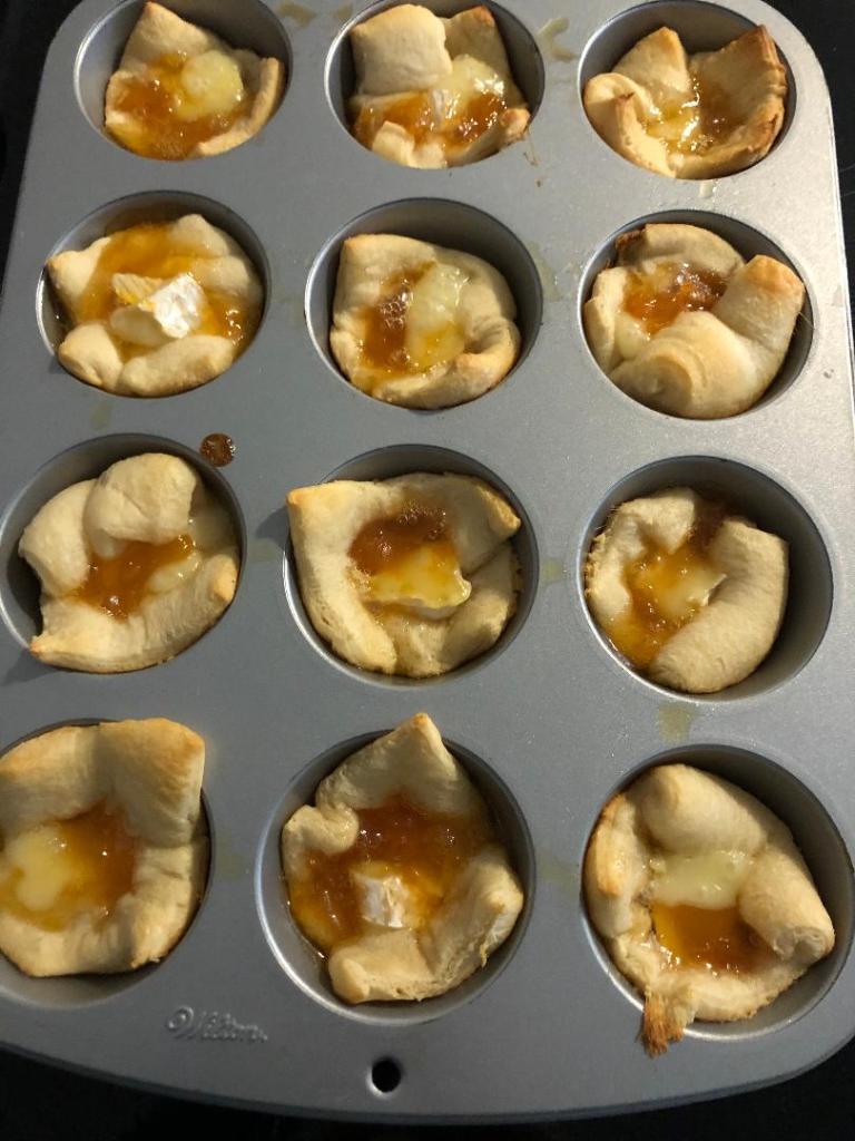 Brie bites here we come. Pop open the cylinder can of dough, cut into squares of 2 by 2. Lay each dough square in each cup of a muffin tray. 24 or 12 cup tray is best size. Drop in a small square of Brie. Pop ontop a sweet topping. Mix it all up. Oven 350 for 20 something minutes. Keep checking bottoms as to not burn.