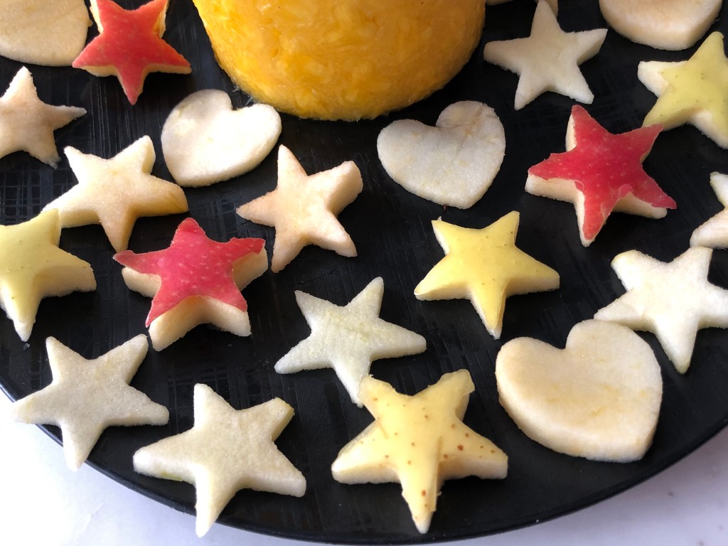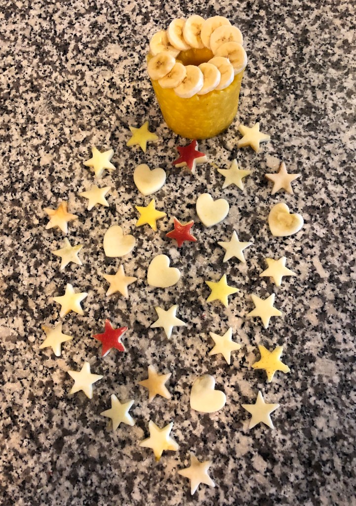 Sometimes, 7 am Monday morning breakfasts aren’t happening, things aren’t rising in the oven, the sun wasn’t shining, and my to-do list wasn’t happening, thus I was gettin’ jiggy wit it, just like Will Smith, and razzle-dazzled up my vitamin c breakfast booster into a constellation of 5-pointed stars, circles, and hearts! Bon appetite!