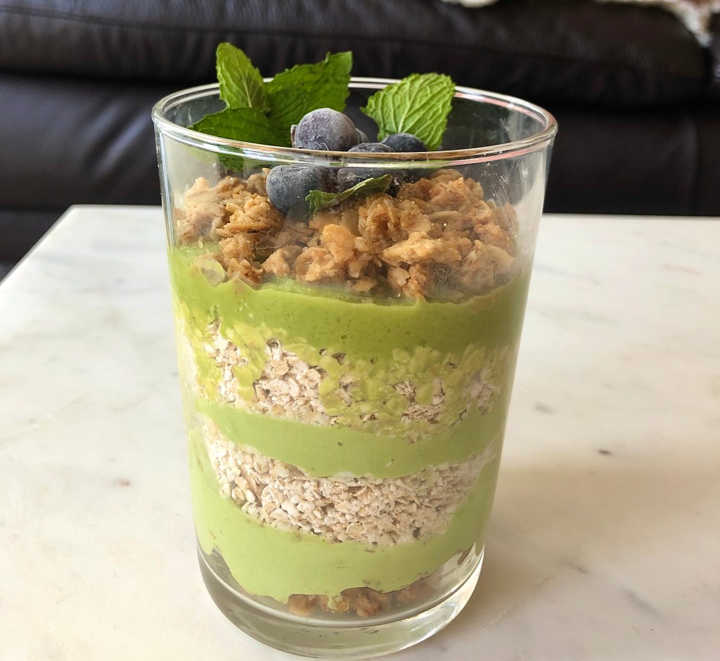 Mint leaves, yogurt, matcha powder, granola or oatmeal, and blue berries, all a great combo, depending on your presentation and fave breakfast noshes you like to work with and quick. Enjoy!