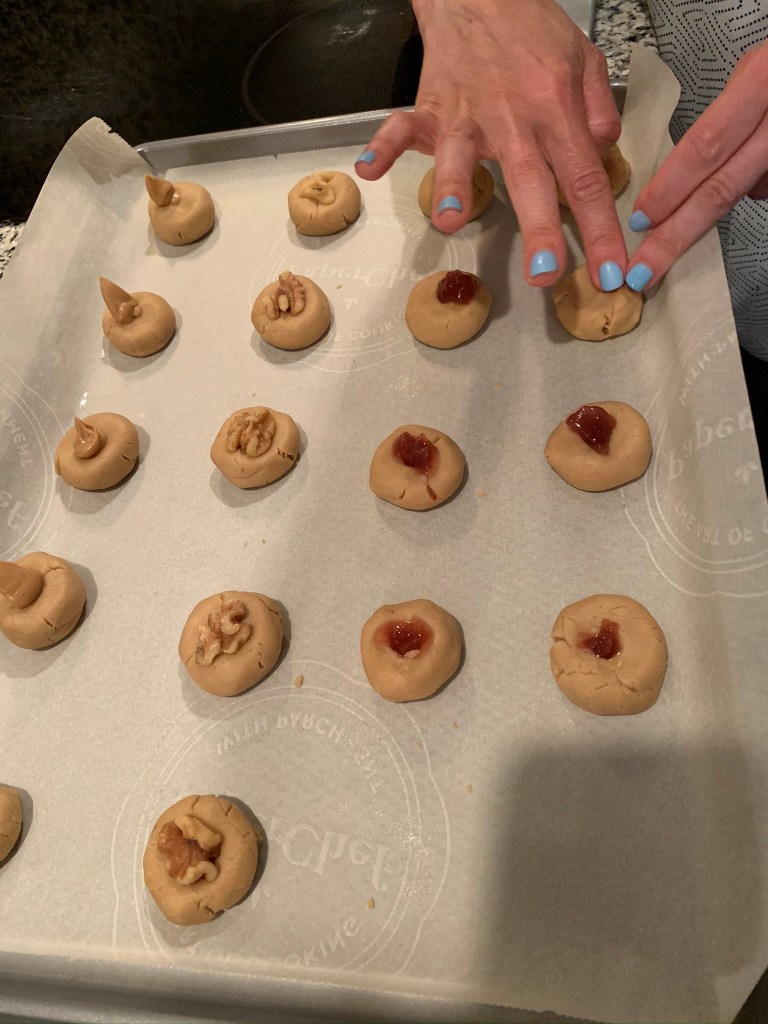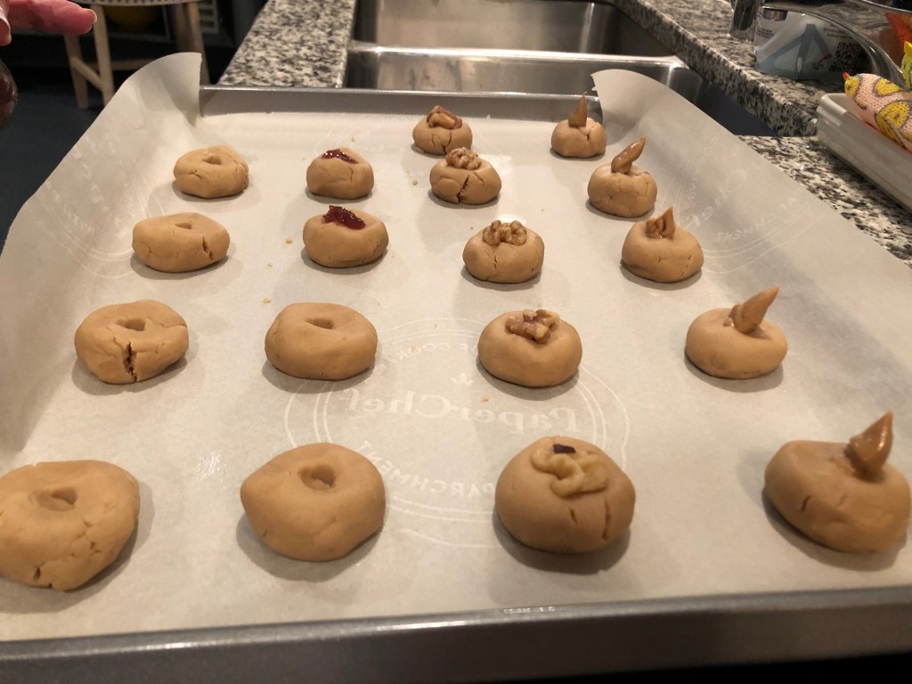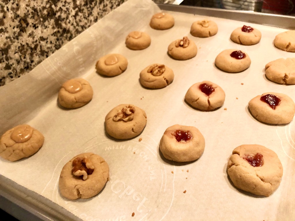 This project was a late-night solution to satisfy a major craving for peanut butter and jelly sandwiches…. thus, these egg-free vanilla cookies were built, with only 4 ingredients. One row had a dab of peanut butter, another row and a half had raspberry jam, and the last row had a special walnut in the middle, leaving 2 left as solo.