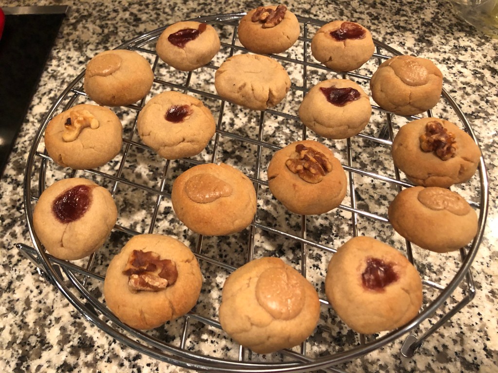 Enjoy these peanut butter and jelly and walnut cookies, with a warm glass of milk!