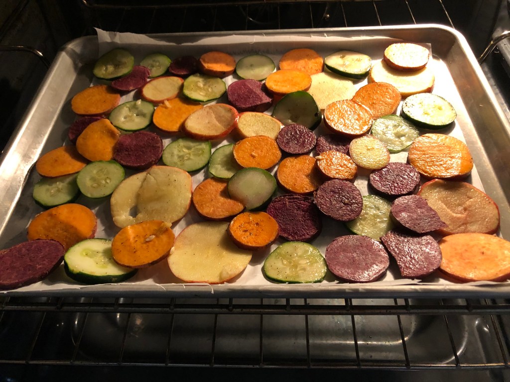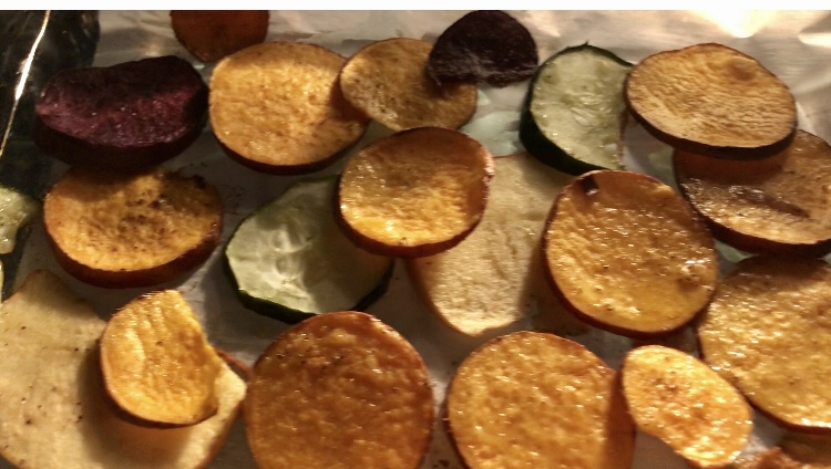 Modern parents and grandparents: “What vegetables would like with your dinner tonight?” Me: “Sweet potatoes or yams, purple potatoes, and English cucumbers.” Them: “Why not throw them onto a non stick baking sheet?” Me: “OMG! So cool!” (Secret… I snuck in apple slices for some extra sweetness)! I then marinated all the veggies and the special fruit in extra virgin olive oil and salt-n-pepa.
