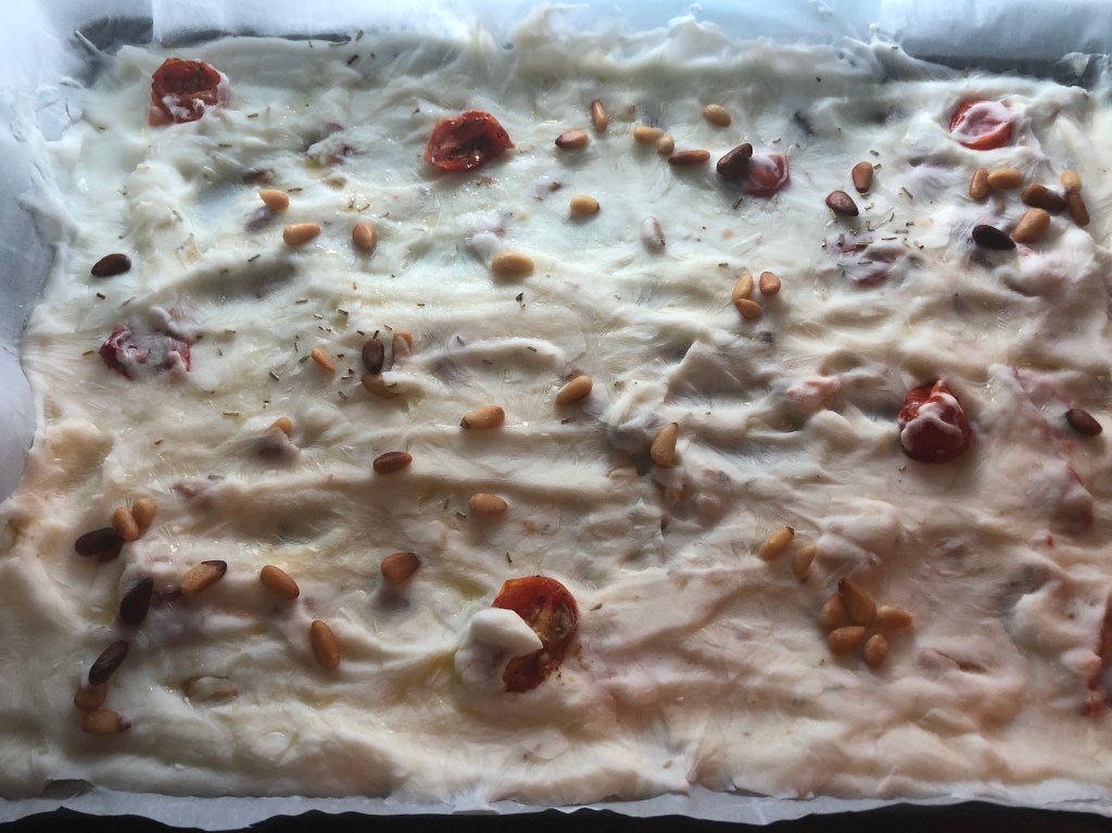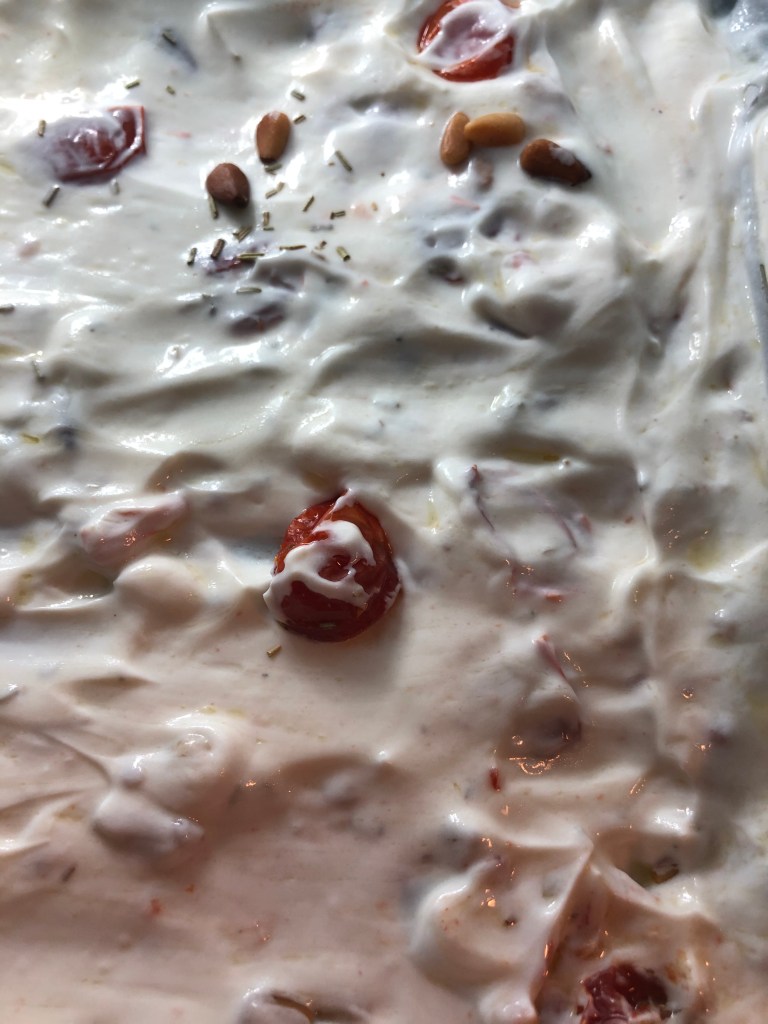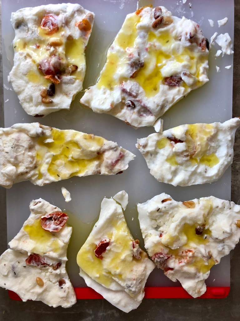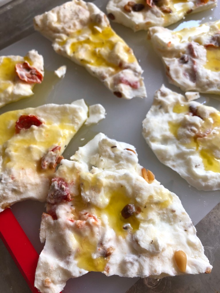 Simple non-recipe details: 32 oz container of Chobani non fat plain Greek yogurt, just enough to fill up a small baking sheet, about 1/4 thick. Rosemary or thyme seasoning. Tomatoes in the oven at 250 for 1.5 hours. Pine nuts at 400 for 5 min. 1 tablespoon of evoo. Then freeze for 4 hours. Gently break into pieces. Drizzle with a bit more evoo right before eating. Must eat ASAP as it melts fast… if not you can always have it as a yogurt bowl snack!