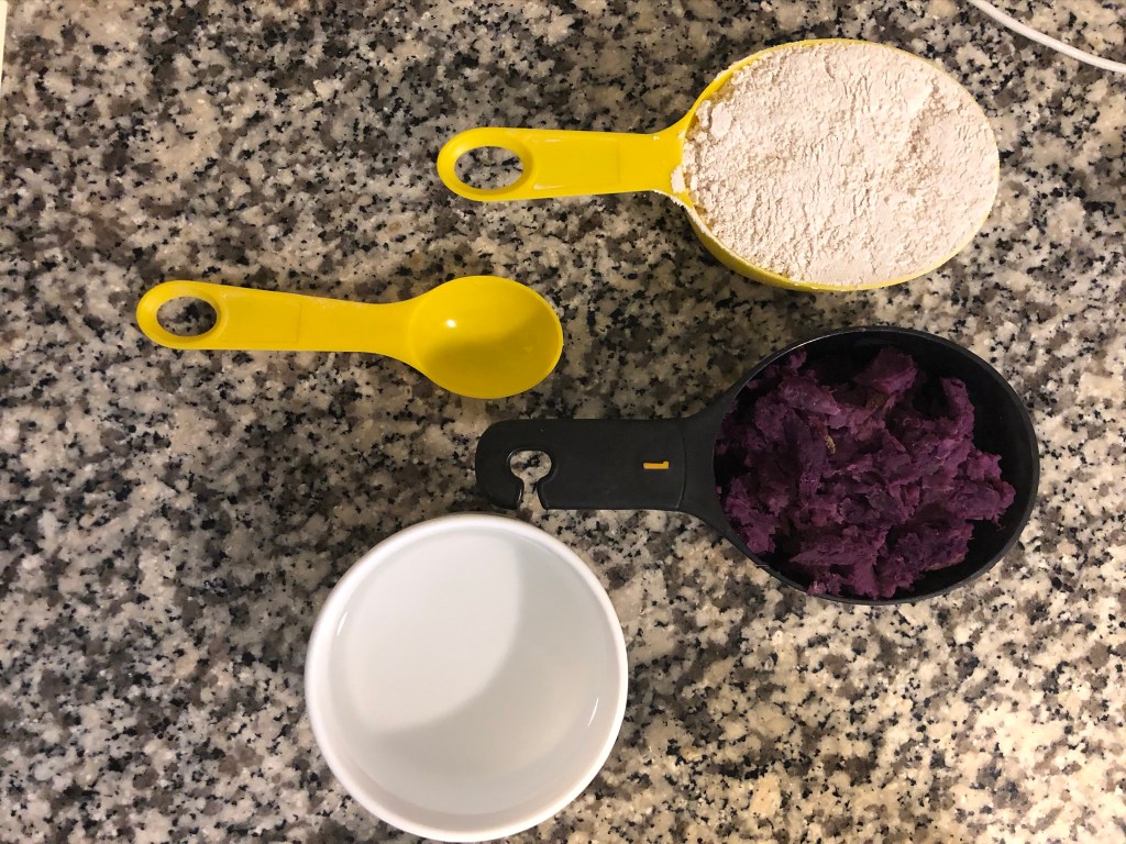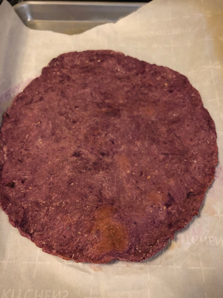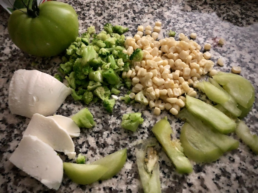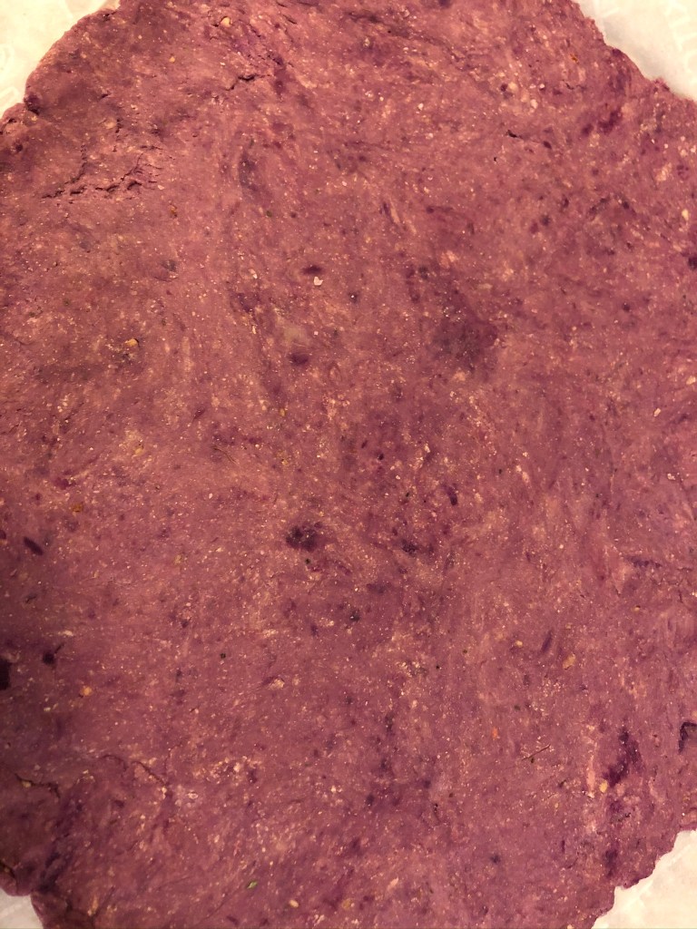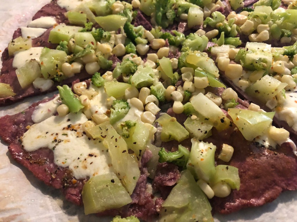Whole wheat pastry flour, purple sweet potatoes, mozzarella cheese, green tomato, and oh yes microwaveable green(eat your veggies) cauliflower/broccoli, and sweet white corn… all whipped in this great recipe.