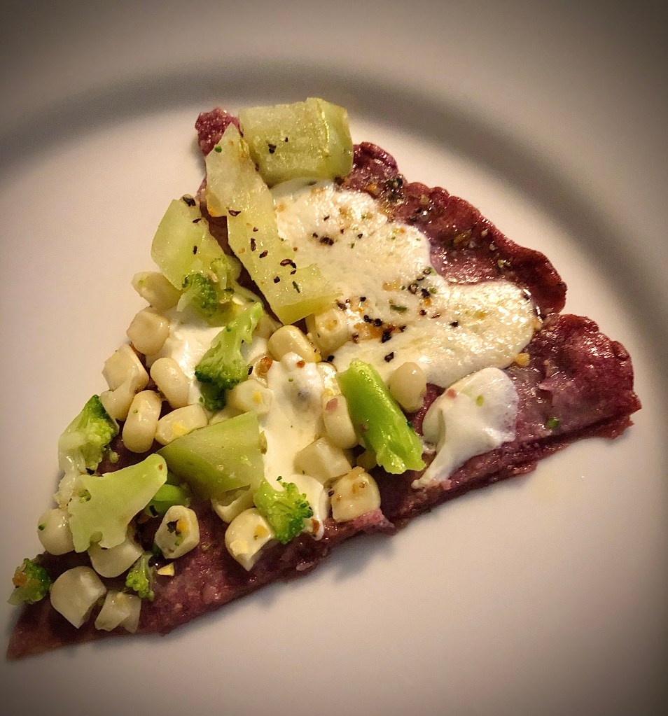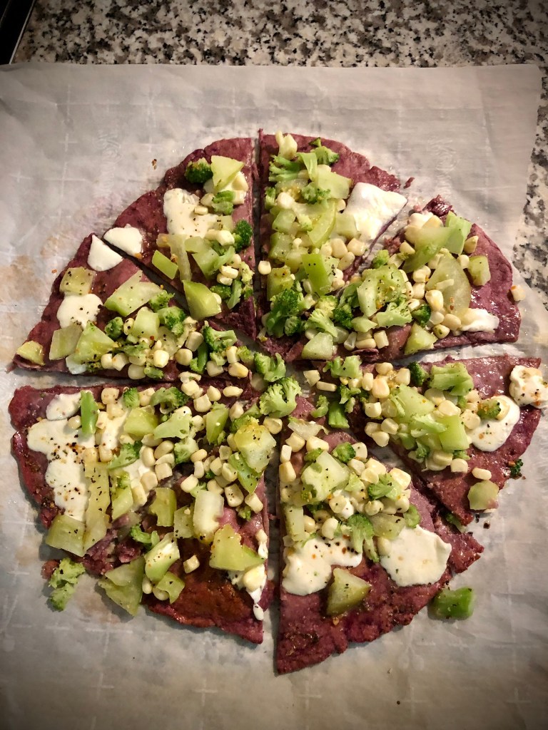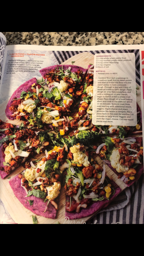 So why not? I noticed a healthy, vegetable based sweet purple potato pizza sitting in this cool Thrive magazine my mom sent me. Not only was it colorful but it was impressive to actually feel hungry and captivated by this wonderfully photographed cover image of plant based, vegetarian pizza!