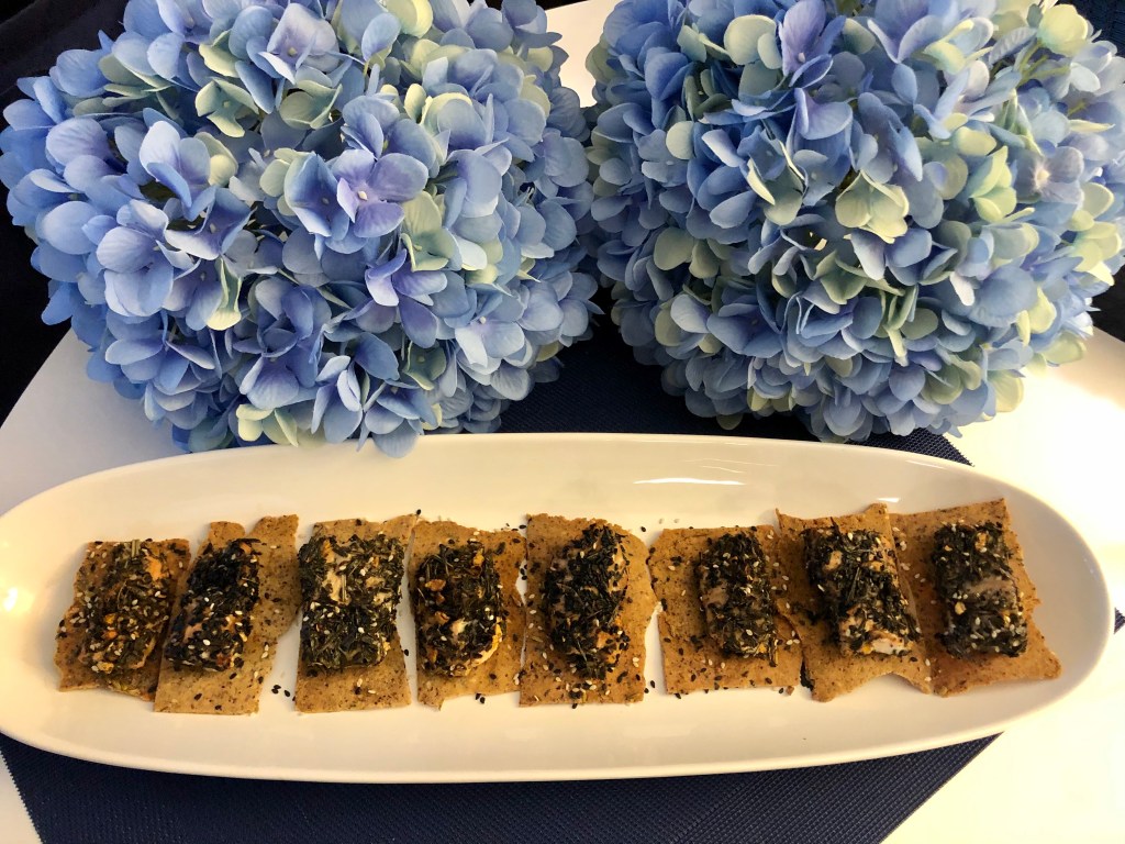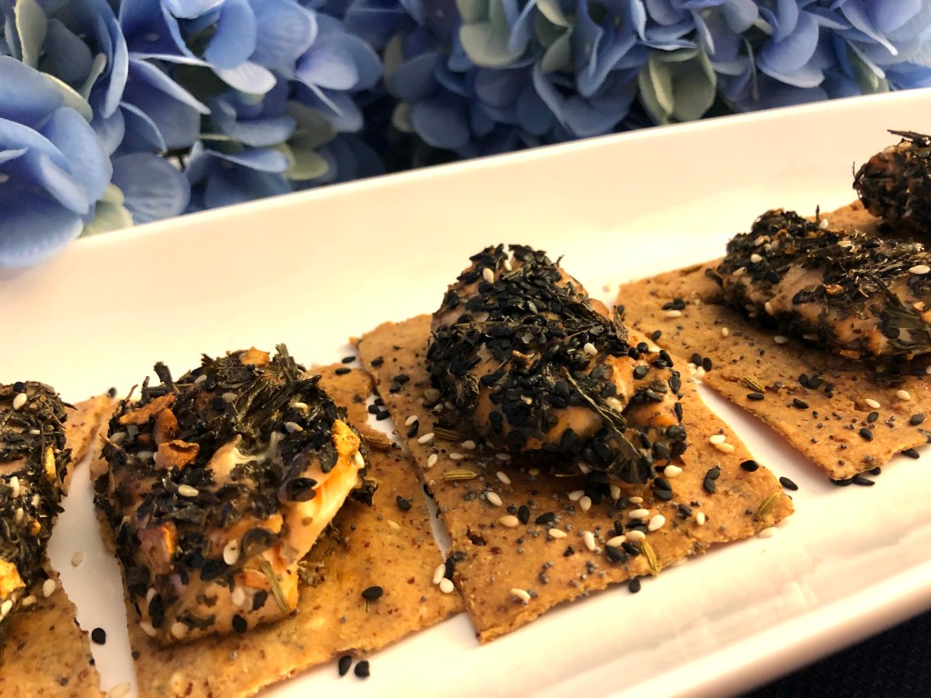 This appetizing app is a great starter to kick off the “break the fast” dinner and slowly keep your hunger at ease with omega 3 nutrients for dinner! Instead of baking another 6 or 8 ounce piece of Atlantic salmon again, why not slice it up? I coated each slice in soy sauce and a seed mixture with green tea leaves and pepper. Baked 20 min and ready to go, warm or cooled!