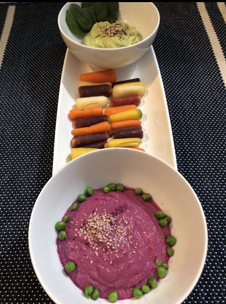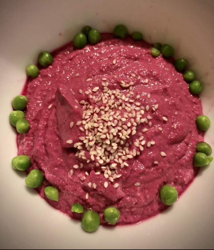 1. Beetroot Hummus green peas, (pumpkin or) butternut squash purée, lemon juice, evoo, salt, and tahini.