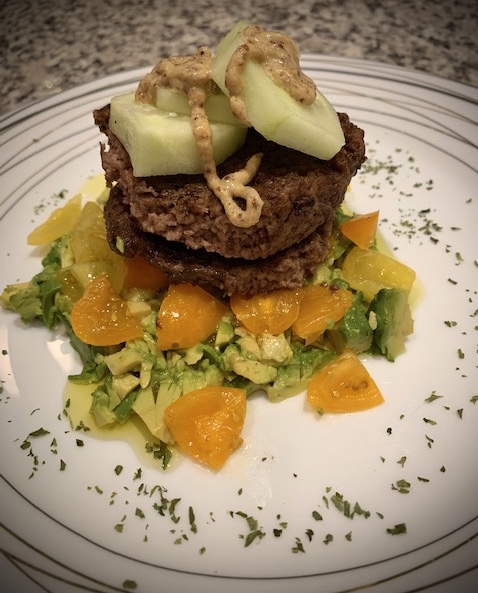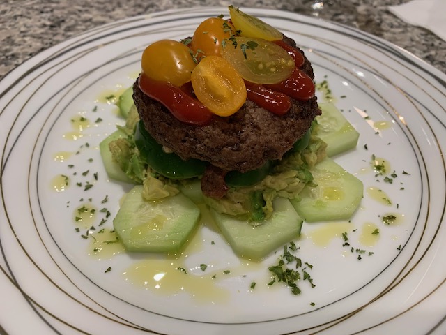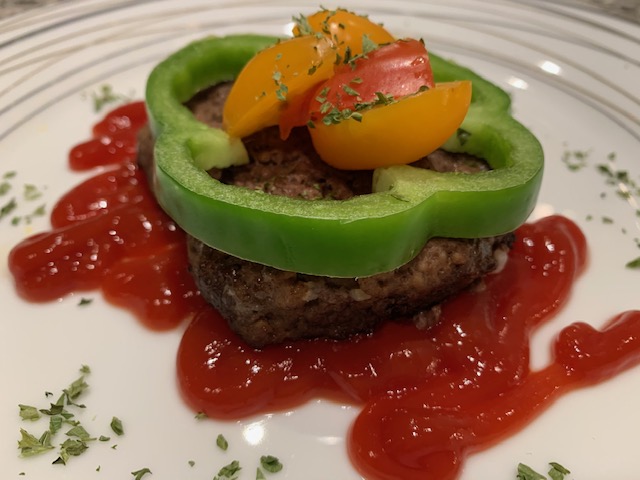 - Plate 1, patty topped with green pepper, heirloom tomatoes, and parsley