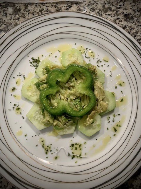 - Plate 3, cucumber bed w avo, evoo, parsley, and green pepper