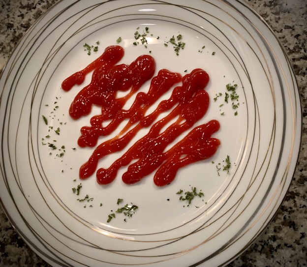- Plate 3, patty topped with ketchup, tomatoes, and parsley