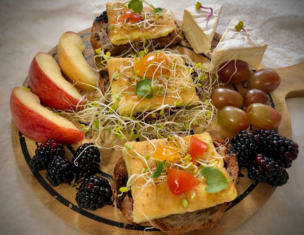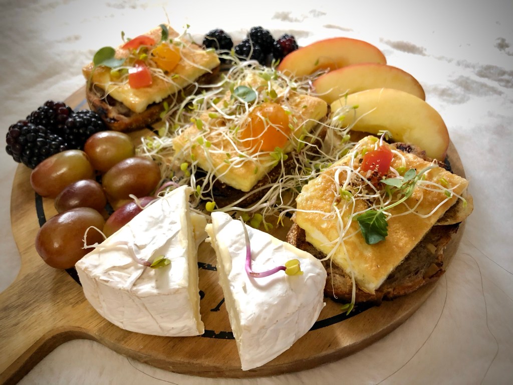 We can start with a wooded board or a lazy Susan. Scurry deep into the shelves of your fridge and gather any fruits or veggies that still look good. Microgreens even! 💡 Fruits, brie cheese, grapes, veggies, and miniature (protein-spot on) egg omelets on cranberrry walnut bread are yummy, noshable examples to build the foundation of this “new, 2021” version!!!!