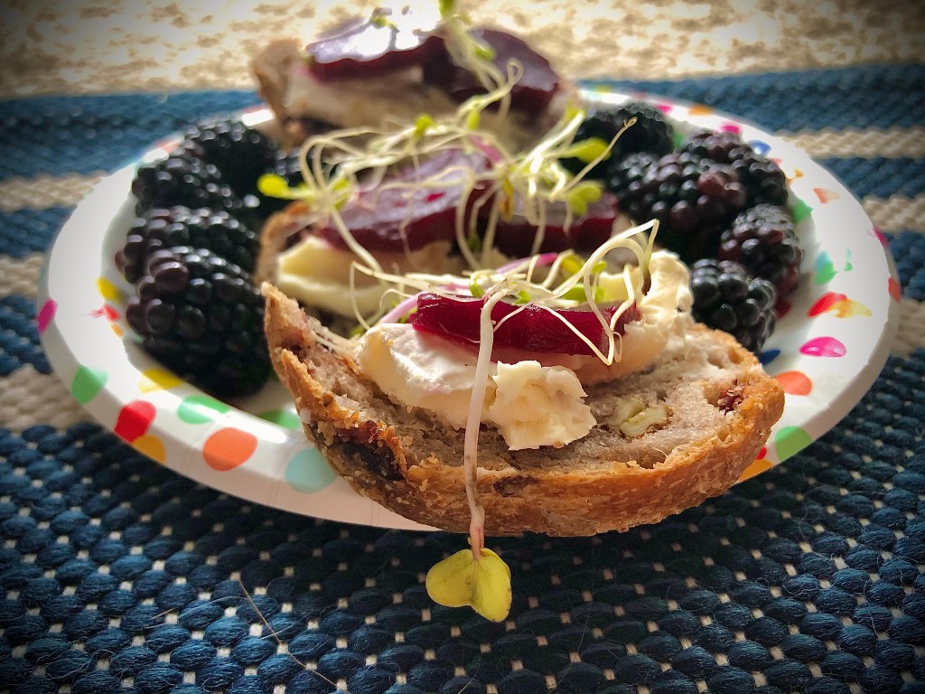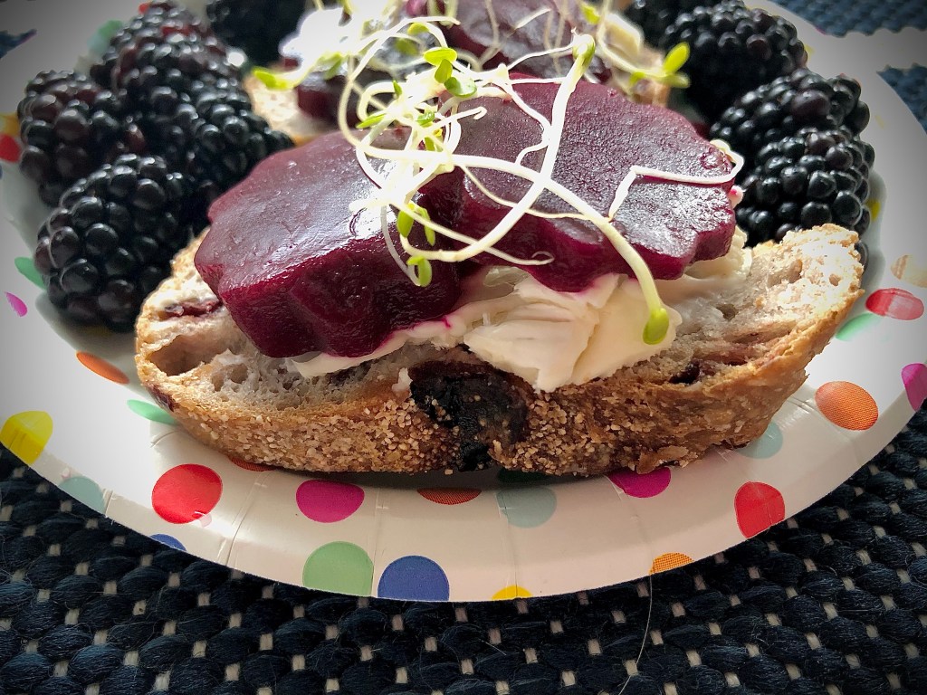 Nat decides to open up her new week with a breakfast nosh experience of toasted cranberry crostini with spreadable brie cheese, beets, and topping off with micro greens….. the taste is such sweeeeeeeeeet perfection!