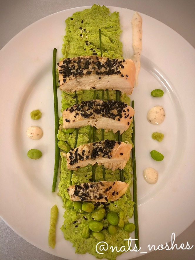 A night of green and white plating … this Nosh experience was so much fun in designing the layout of the plate and testing which flavors of garnish would work best. I have been obsessed with this horseradish sauce that has a little spicy kick. I dotted along the sides of the centerpiece with the sauce and wasabi.