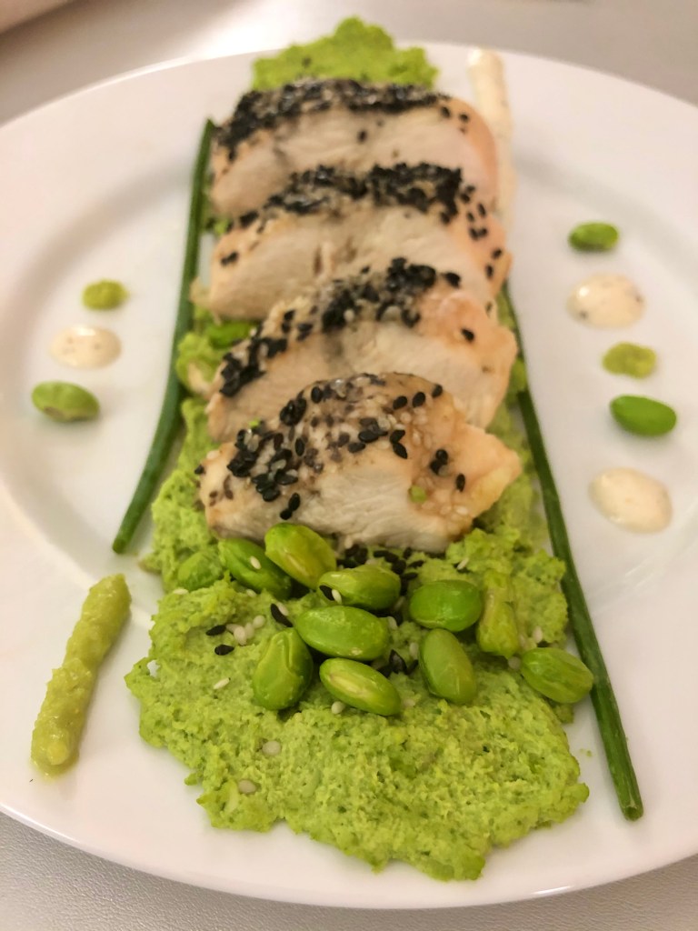 Purée method was food processor blended edamame, extra virgin olive oil, a few splashes of leftover cabbage for that veggie vitamin fix, and some vegetable or chicken sodium free soup stock!