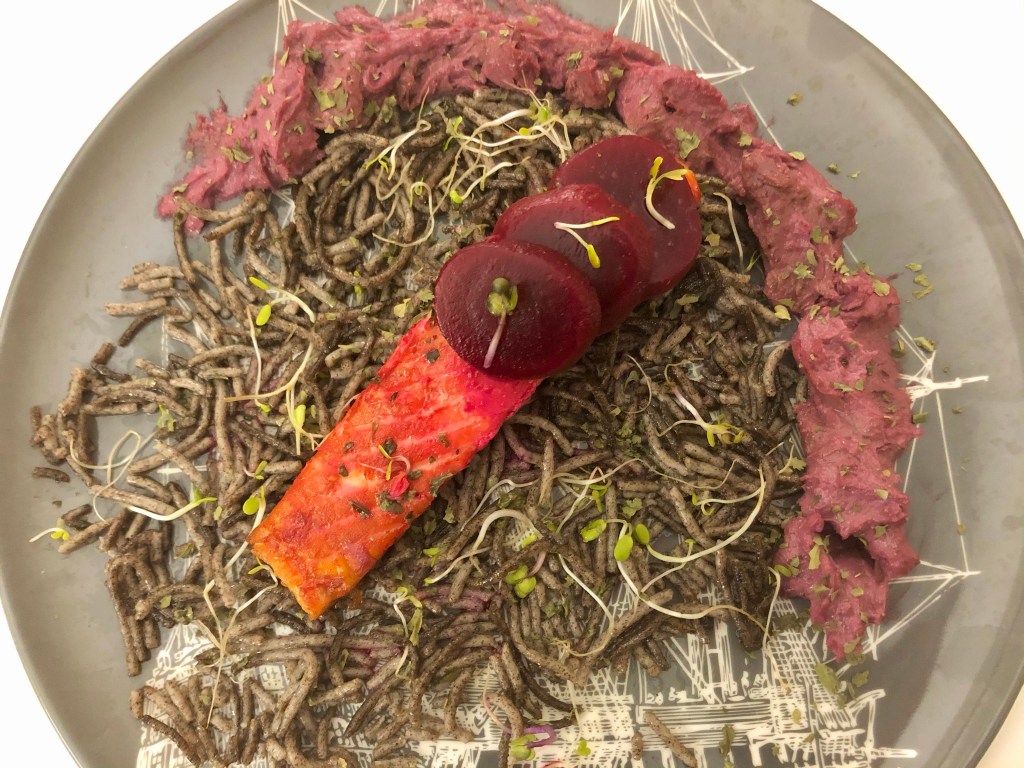 Salmon marinated in beets (for 36 hours!), buckwheat noodles (homemade from pasta machine), purple sweet potato/beet hummus (homemade), and micro greens mixed in…