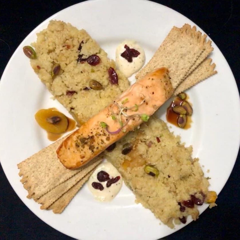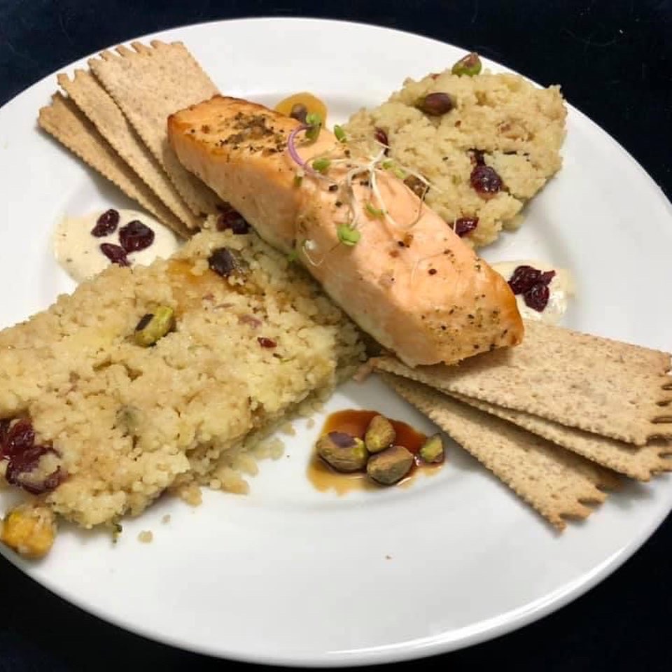 Moroccan fusion plating… Grilled salmon on a bed of Moroccan couscous with craisins, dried apricots, dates, and pistachios. Sided with artisan crackers, craisins in horseradish sauce, and pistachios in date syrup….