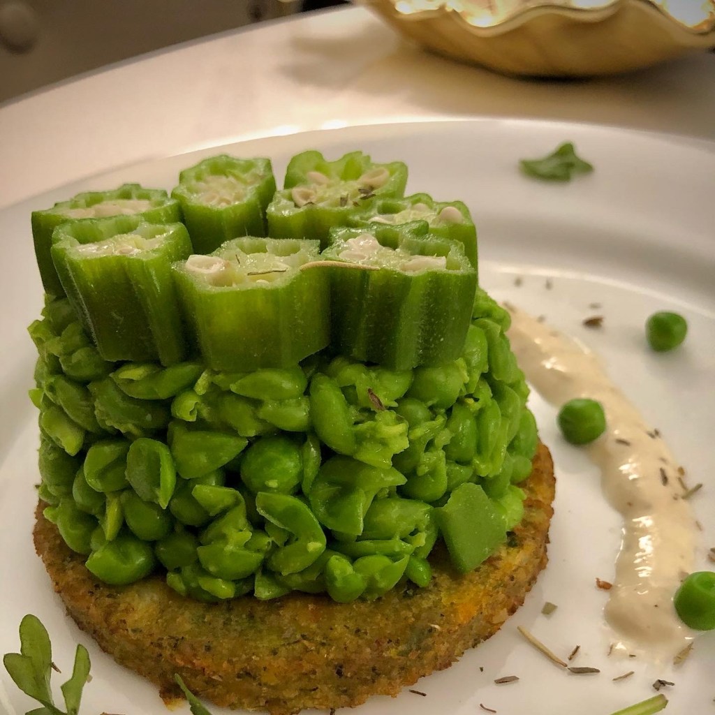 I stacked these okay beauties on a bed of crushed frozen green peas which were stacked on a veggie burger…. marvelous!!