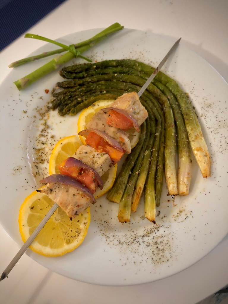 Some Mediterranean inspiration with kebob skewers, curved asparagus, evoo, seasonings, and a zest of lemon juice all over.